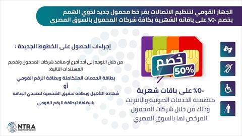أقر الجهاز القومي لتنظيم الاتصالات، إتاحة خط محمول جديد للمستخدمين من متحدي الإعاقة بخصم ٥٠% على باقاته الشهرية، متضمنة الخدمات الصوتية والانترنت، وذلك من خلال شركات المحمول المرخص لها بالسوق المصري.