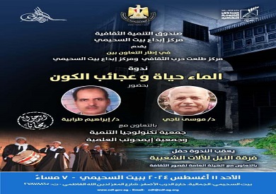 يقيم قطاع صندوق التنمية الثقافية، برئاسة الدكتور وليد قانوش، بمركز إبداع بيت السحيمي بشارع المعز، بالتعاون مع مركز إبداع طلعت حرب التابع للصندوق، ندوة جديدة بعوان "الماء حياة وعجائب الكون"، في السابعة مساء غداً (الأحد).