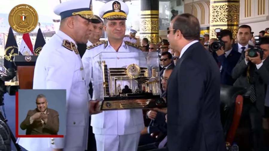 تسلم الرئيس عبد الفتاح السيسي، اليوم الثلاثاء، هدية تذكارية من مساعد وزير الداخلية رئيس أكاديمية الشرطة اللواء دكتور هاني أبو المكارم، وذلك خلال الاحتفال بتخريج دفعة جديدة من طلاب كلية الشرطة.