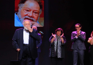وكان الراحل أحمد راتب الاسم الثاني على قائمة التكريم، وتسلمت الدرع زوجته وقدمه لها الفنان محمد محمود، ثم صعد إلى خشبة المسرح للتكريم المخرج سمير العصفوري، وحرص على تسليمه الدرع الفنان أحمد عبد العزيز.