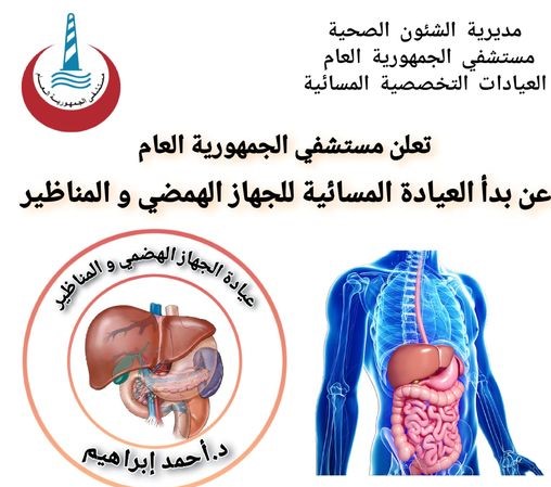 أعلن الدكتور أحمد إبراهيم مدير مستشفى الجمهورية العام بالإسكندرية، عن تشغيل عيادة جديدة ضمن العيادات المسائية المتميزة بالمستشفى، وهي عيادة الجهاز الهضمي والمناظير يوم الثلاثاء من كل أسبوع من الساعة الثانية وحتى الرابعة مساء.