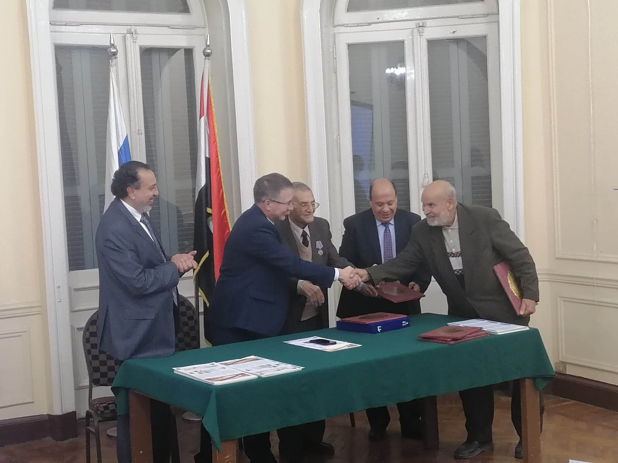 وكرم المركز المهندس صبري العشماوي رئيس جمعية بناة السد العالي بدرع المؤسسة المصرية الروسية للثقافة والعلوم، ومجموعة مم بناة السد العالي.