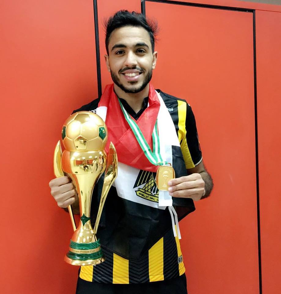 نشر محمود عبدالمنعم كهربا لاعب اتحاد جدة السعودي صورة له على موقع التواصل الاجتماعي "فيسبوك" حاملا كأس ولي العهد السعودي.