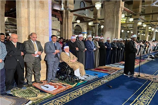 ووتقدم المصلين فضيلة الدكتور محمد الضويني، وكيل الأزهر، عضو هيئة كبار العلماء، وفضيلة الدكتور أحمد عمر هاشم، عضو هيئة كبار العلماء، ونخبة من علماء وقيادات الأزهر الشريف، وأقيمت صلاة العشاء والتراويح من سور العنكبوت والروم ولقمان، برواية ورش عن نافع المدني، ورواية خلف العاشر، ورواية الدوري عن ابن عمر البصري، ورواية روح عن يعقوب الحضرمي.