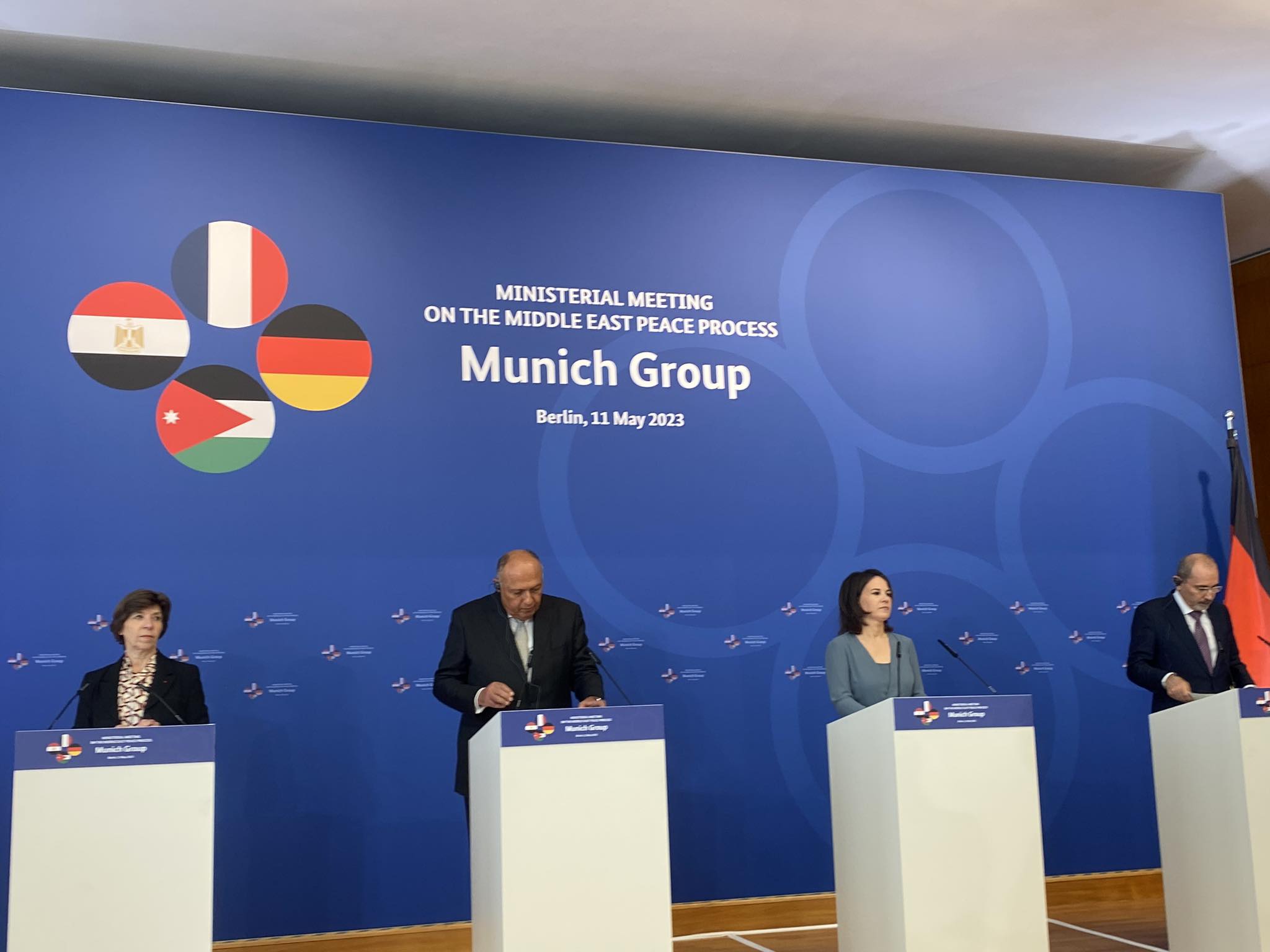 جاء ذلك خلال وقائع المؤتمر الصحفي المشترك لوزراء خارجية مصر والأردن وألمانيا وفرنسا، عقب انتهاء الاجتماع الوزاري لصيغة ميونخ حول عملية السلام، لبحث آخر تطورات الوضع في الشرق الأوسط، وهو اللقاء السابع الذي يجمعهم منذ فبراير 2020.