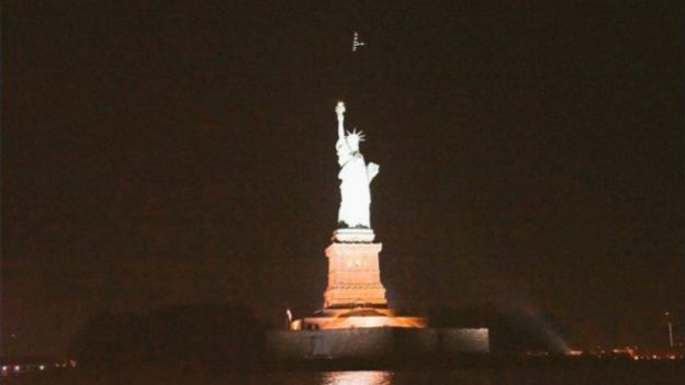 وتحدث الطيار أندريه بورشبرغ، قائد الطائرة، إلى بي بي سي عبر هاتف القمر الصناعي عندما اقترب من تمثال الحرية.