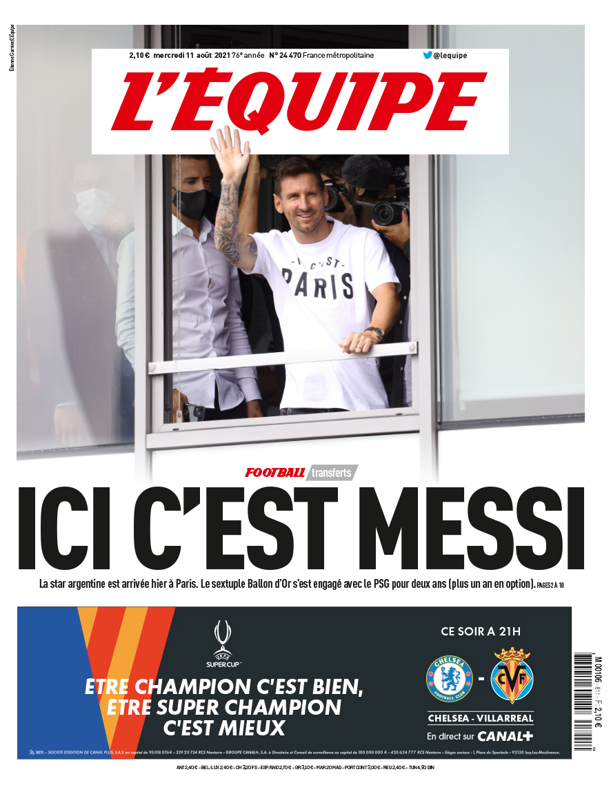 من جهتها، عنونت صحيفة ليكيب "هنا ميسي"، في إشارة لشعار "هنا باريس"، الذي حمله قميص النجم الأرجنتيني، مؤكدةً أن النادي لم يعد بإمكانه أن يحلم بشىء أكبر من ذلك، معتبرة أن وصول "الليو" يضع الفريق في مجرة أخرى.