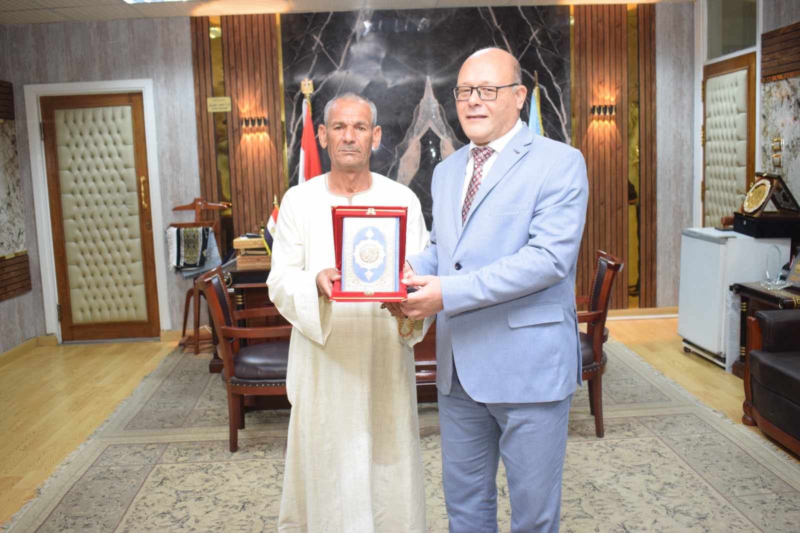وفي ختام اللقاء أهدى رئيس الجامعة، المكرم، المصحف الشريف، تقديراً لما بذله من مجهودات ولإصراره على التعليم في هذه السن المتقدمة، موجهًا بإعفائه من رسوم السكن بالمدينة الجامعية، وتيسير كل إجراءاتها.