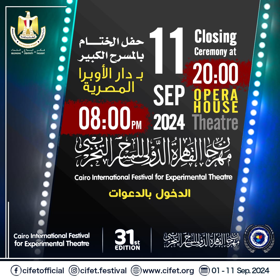 يُكرم خلال حفل الختام، كلا من اسم الراحل الفنان أحمد راتب، واسم الدكتورة الراحلة عايدة علام أستاذة المسرح بكلية الآداب بجامعة حلوان، ويعقبه توزيع جوائز الدورة الحادية والثلاثين التي أقيمت باسم الدكتور علاء عبد العزيز، ويقدم حفل الختام باللغتين العربية والإنجليزية الفنانة نورهان، ويعلن الجوائز رئيس لجنة التحكيم الدكتور مدحت العدل، وبمشاركة أعضاء اللحنة، وهم: النجمة سلوى محمد علي (مصر)، الفنان جون سيبي أوكومو (كينيا)، الفنان ساڤاس پاتساليدس (اليونان)، الفنان مارت ميوس (استوانيا)، الفنان والأكاديمي د. عبدالاله السناني (السعودية)، الكاتب والروائي هزاع البراري (الأردن).