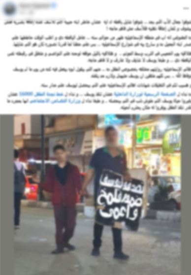 رصدت أجهزة وزارة الداخلية تداول تعليق مدعوم بصورة بمواقع التواصل الاجتماعى تضمن استغلال شخص نجله "من ذوى الهمم" فى استجداء المارة بالشوارع بالإسماعيلية.