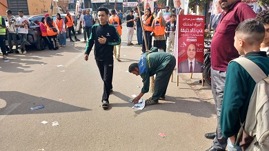 يعمل إسماعيل مع ثلاثة من زملائه في فريق واحد، يتحركون في صمت وسط الزحام، يجمعون الأعلام والمنشورات التي تسقط أولا بأول على الأرض، ويقول لـ«الشروق» بابتسامة متعبة وهو يلتقط بطاقة دعائية ممزقة: "بننضف أول بأول.. علشان الصورة تفضل حلوة".