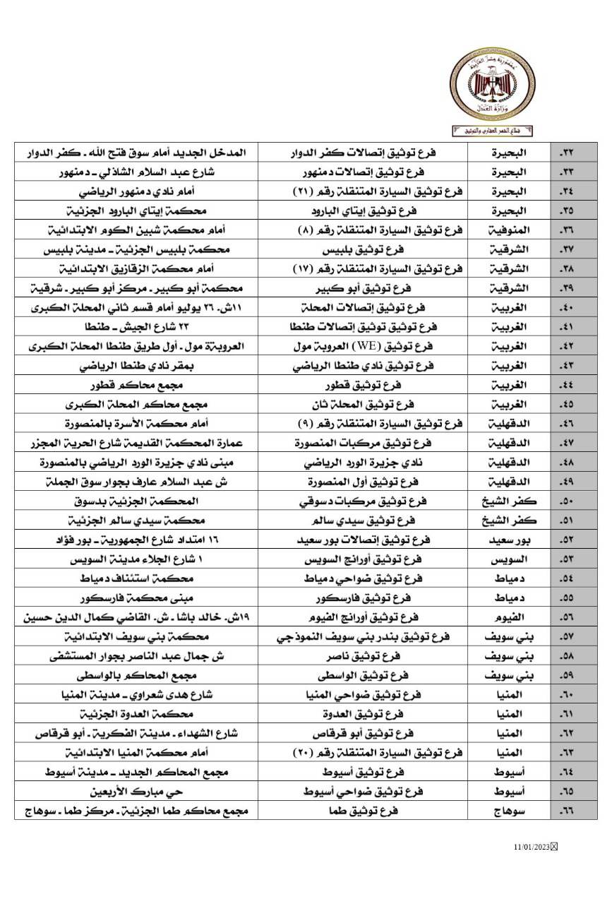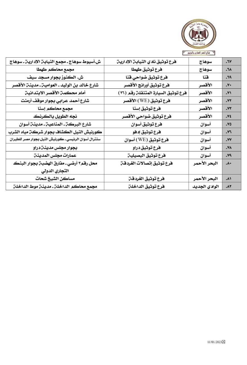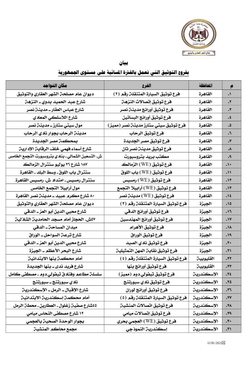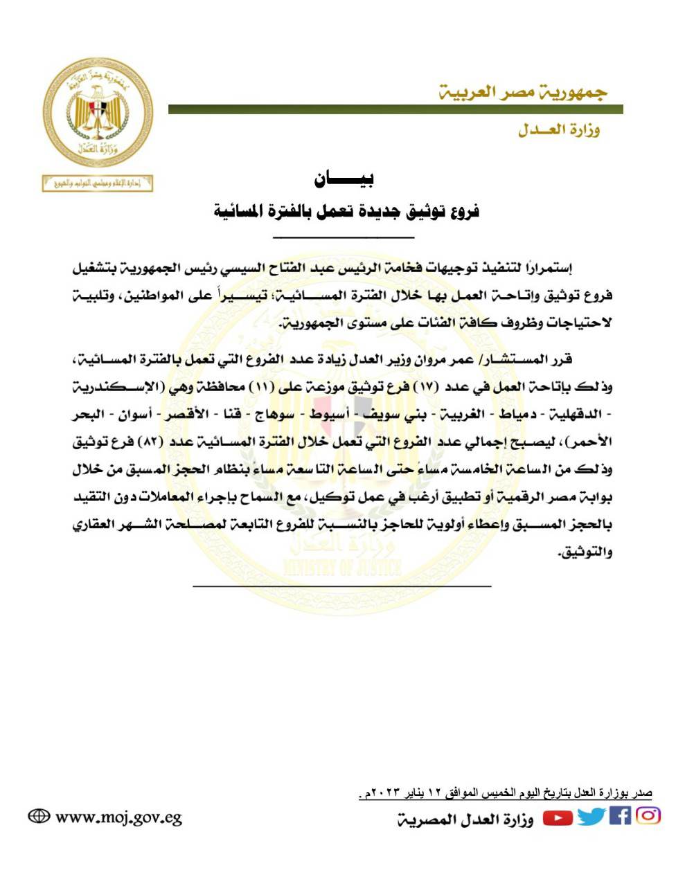 قرر المستشار عمر مروان وزير العدل زيادة عدد الفروع التي تعمل بالفترة المسائية، وذلك بإتاحة العمل في 17 فرع توثيق موزعة على 11 محافظة وهي: "الإسكندرية - الدقهلية - دمياط - الغربية - بني سويف - أسيوط - سوهاج - قنا - الأقصر - أسوان - البحر الأحمر".
