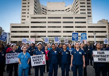 وقالت النقابة في بيان صدر يوم الاثنين: "بعد أشهر من المساومة، رفضت الإدارة تحقيق تقدم ملموس في القضايا الأساسية التي ناضل العاملون في قطاع التمريض من أجلها وهي توظيف عدد كاف من العمالة للرعاية بالمرضى بشكل آمن، وتوفير مزايا الرعاية الصحية للممرضات والحماية من العنف في مكان العمل. وتهدد الإدارة في أغنى المستشفيات في مدينة نيويورك بوقف المزايا الصحية للممرضات أو خفضها بشكل جذري".