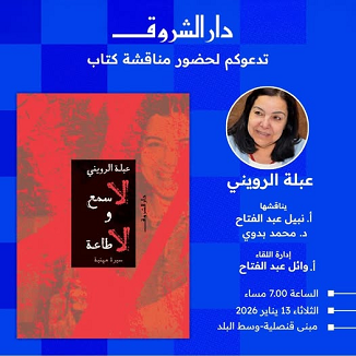 تنظم دار الشروق، مناقشة كتاب «لا سمع ولا طاعة.. سيرة مهنية» للكاتبة عبلة الرويني، غدًا الثلاثاء 13 يناير، في تمام الساعة السابعة مساءً، بمقر مبنى قنصيلة بوسط البلد.