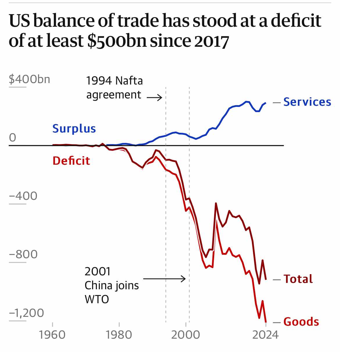 ففي عام 2024، سجلت الولايات المتحدة عجزًا تجاريًا في السلع يزيد على 1.2 تريليون دولار، أي 970 مليار جنيه إسترليني مع بقية العالم، لكنها حققت فائضًا يقارب 300 مليار دولار في الخدمات.
