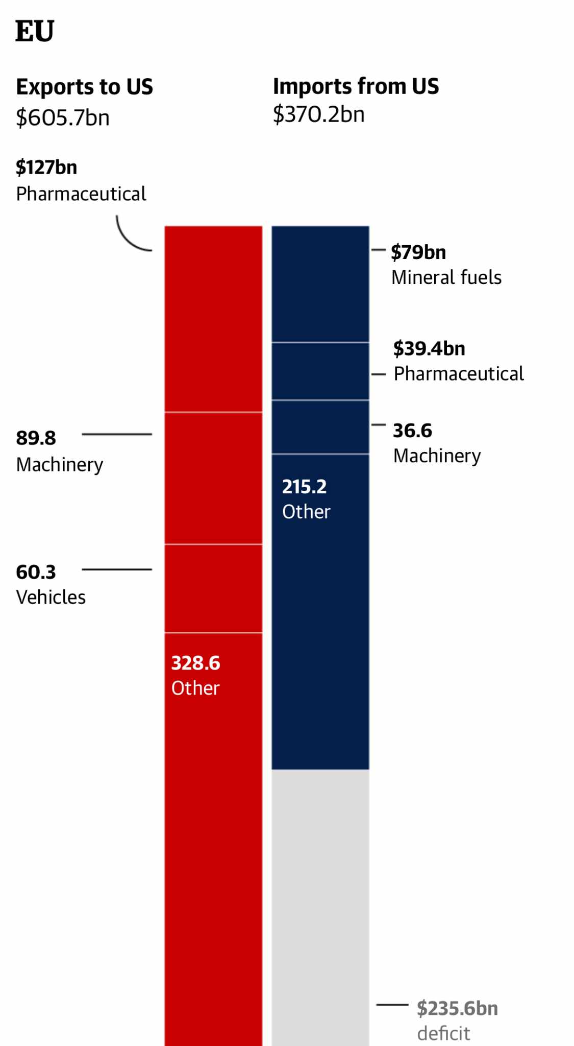 هدد ترامب بفرض تعريفات جمركية على الاتحاد الأوروبي، لكنه لم ينفذ ذلك بعد، وتشير البيانات إلى أن المنتجات الصيدلانية، مثل اللقاحات، إلى جانب الآلات والسيارات، تشكل نحو نصف صادرات الاتحاد الأوروبي إلى الولايات المتحدة.