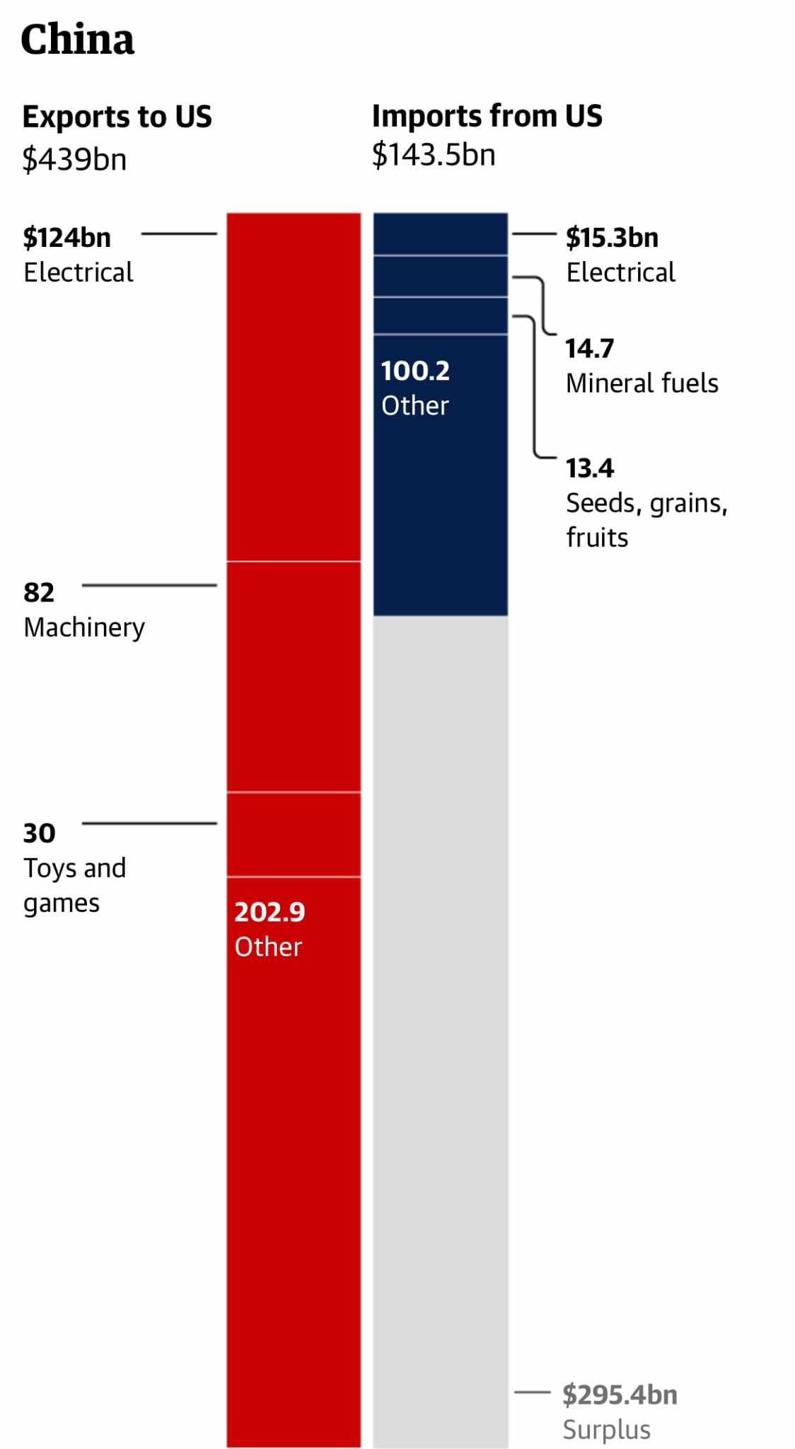 أخيرًا، تأتي الصين، التي ردّت بفرض تعريفات جمركية انتقامية على الولايات المتحدة. وتشكل الأجهزة الكهربائية، مثل أجهزة الكمبيوتر والهواتف والبطاريات، بالإضافة إلى الألعاب، نصف صادراتها إلى السوق الأمريكية.