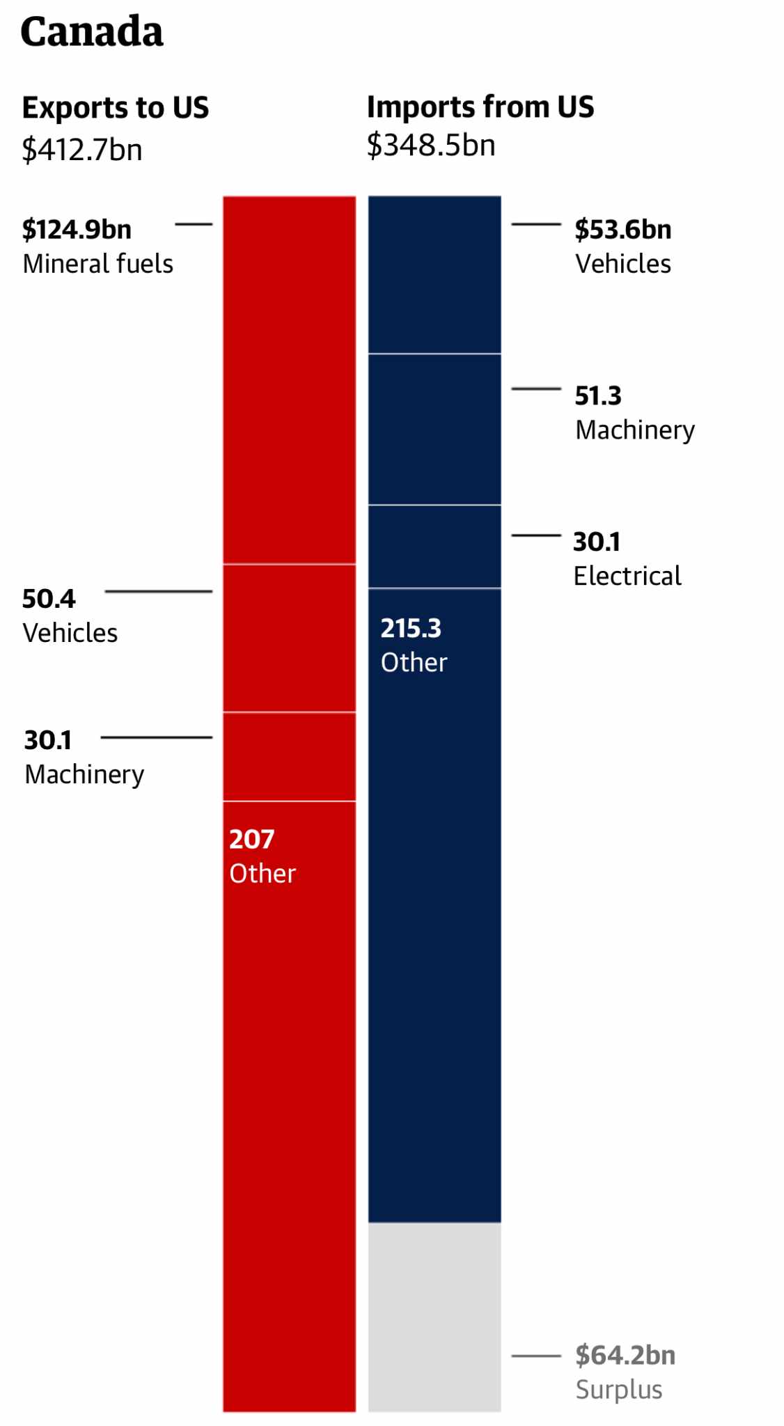 تُعد كندا واحدة من أولى الدول التي استهدفتها تعريفات ترامب خلال ولايته الثانية. وتتمثل أبرز صادراتها إلى الولايات المتحدة في الوقود الأحفوري والسيارات والآلات، بما في ذلك التوربينات النفاثة والمحركات المكبسية، بينما تصدر لها الولايات المتحدة أيضًا السيارات والمعدات الصناعية.
