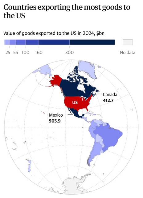 تشكل الولايات المتحدة الوجهة الرئيسية للسلع المصدرة من كندا والمكسيك، حيث تستقبل 80% من الصادرات المكسيكية و78% من الصادرات الكندية، وفقًا لإحصائيات البلدين.