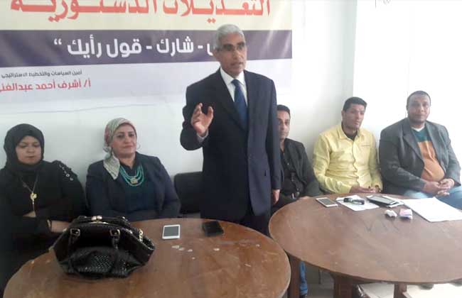 وأضاف عبد الغني أن تلك الندوة تعد أولي سلسلة ندوات أمانة السياسات ينفذها الحزب لشرح المواد المعدلة بالدستور وأهمية المشاركة والخروج بكثافة لصناديق الاقتراع بمختلف مراكز المحافظة وذلك ضمن فعاليات الحملة التي أطلقها الحزب تحت شعار "إنزل.. شارك .. قول رأيك"، مؤكدًا أنه تم خلال ندوة اليوم تشكيل فرق من المتطوعين من أعضاء الحزب بمختلف المراكز لشرح التعديلات والتأكد علي أهمية المشاركة في الاستفتاء على التعديلات الدستورية.