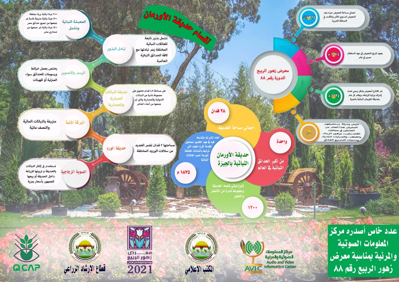 أصدر مركز المعلومات الصوتية والمرئية التابع لوزارة الزراعة واستصلاح الأراضي، انفوجراف وفيديو، بالتعاون مع المكتب الإعلامي للوزارة، وقطاع الإرشاد الزراعي، يشمل أبرز المعلومات الخاصة بحديقة الأورمان النباتية بالجيزة، ومعرض زهور الربيع الذي يفتتحه السيد القصير وزير الزراعة واستصلاح الأراضي، غدا السبت، في نسخته رقم 88.