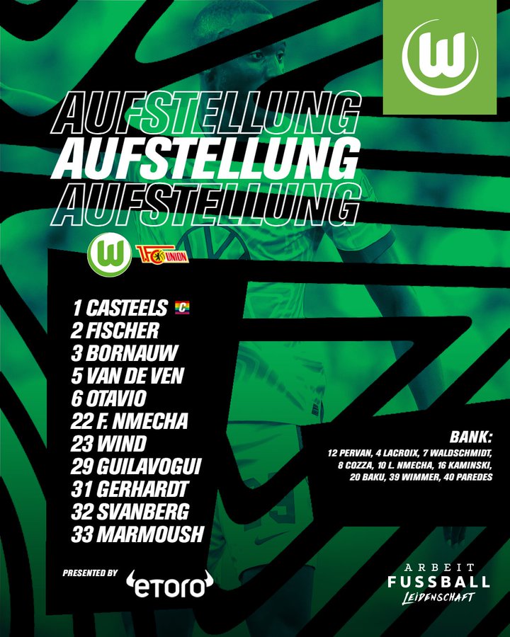 أعلن نيكو كوفاتش، المدير الفني لفولفسبورج، تشكيل فريقه لمباراة يونيون برلين، اليوم الأحد، على ملعب فوكسفاجن أرينا، ضمن منافسات الجولة الـ24 من الدوري الألماني.
