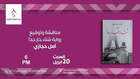 يقيم مركز الهالة الثقافي، ندوة لمناقشة كتاب «شتاء حار جدًا» للكاتبة أمل حجازي، وذلك يوم السبت الموافق 20 إبريل، في تمام الساعة السادسة مساء، بمقر مكتبة «الهالة» في 26 شارع 261 بميدان الجزائر في المعادي.