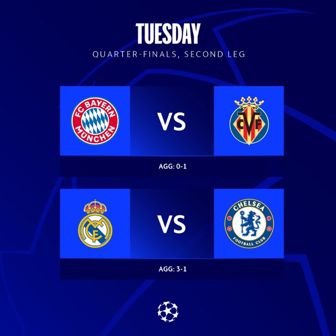 تقدم بوابة الشروق تغطية حية ولحظة بلحظة لمباراتي إياب دور ربع النهائي من دوري أبطال أوروبا بين ريال مدريد الإسباني وتشيلسي الإنجليزي والتي تُقام على ملعب سانتياجو بيرنابيو، وبايرن ميونخ الألماني أمام فياريال الإسباني والتي تُقام على ملعب أليانز أرينا.