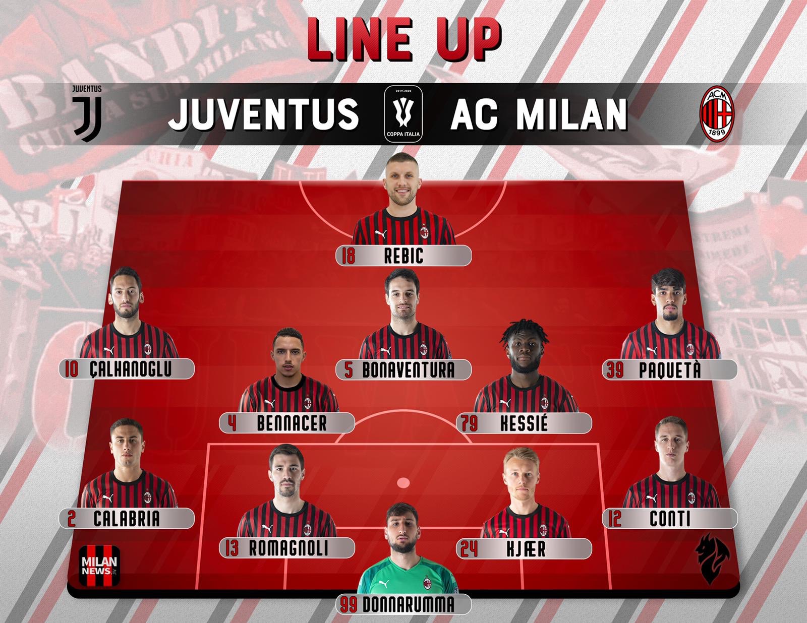 أعلن ستيفانو بيولي المدير الفني لميلان، عن تشكيل فريقه، لمباراة يوفنتوس والتي ستقام مساء اليوم الجمعة، ضمن إياب نصف نهائي كأس إيطاليا.