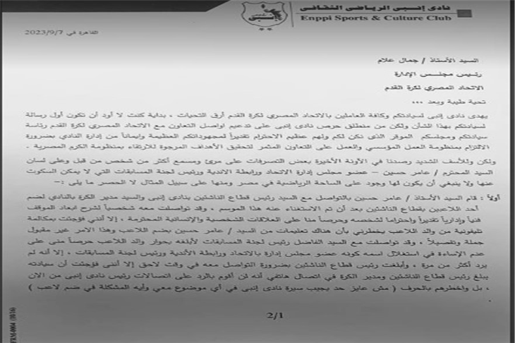 تقدم نادي إنبي بشكوى رسمية إلى اتحاد الكرة، برئاسة جمال علام، للاعتراض على تصرفات عامر حسين، المشرف العام على المسابقات برابطة الأندية وعضو مجلس إدارة الاتحاد.