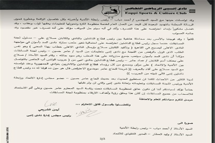 وأتم إنبي أنه سينسحب من جميع المسابقات حال عدم التصدي لتلك التصرفات التي تمت من قبل عامر حسين، والتي تُعرقل مسيرة النادي.