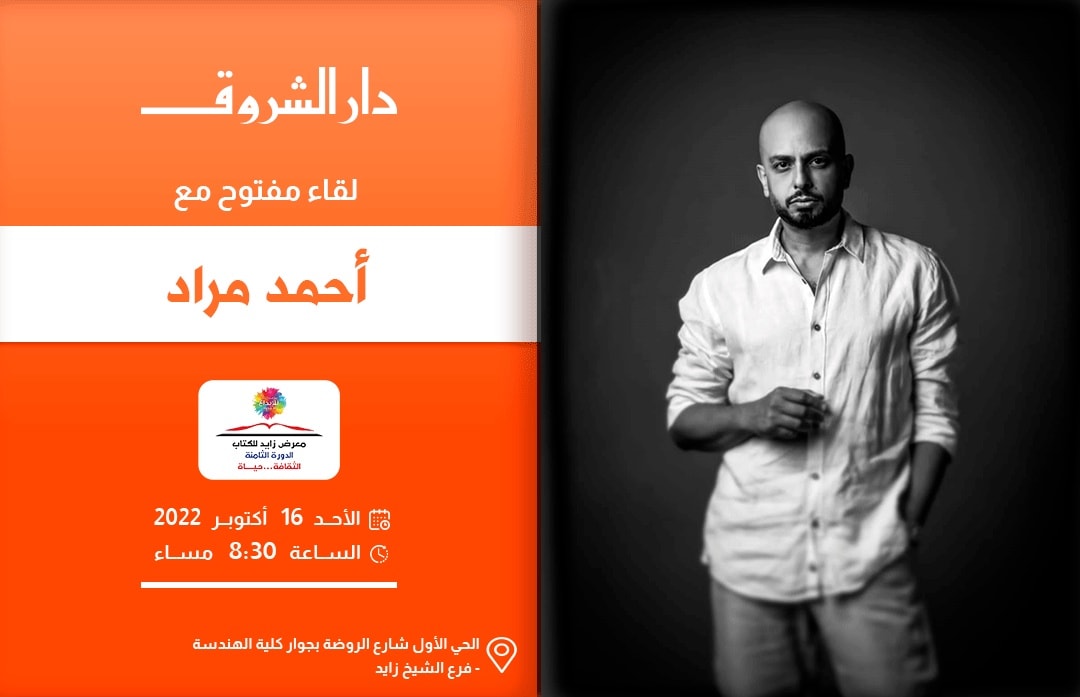 أعلنت دار الشروق عن تنظيم لقاء مفتوح مع الكاتب والسيناريست أحمد مراد في معرض زايد للكتاب 2022، وذلك يوم الأحد المقبل في تمام الساعة الثامنة ونصف مساء بمعرض زايد للكتاب.