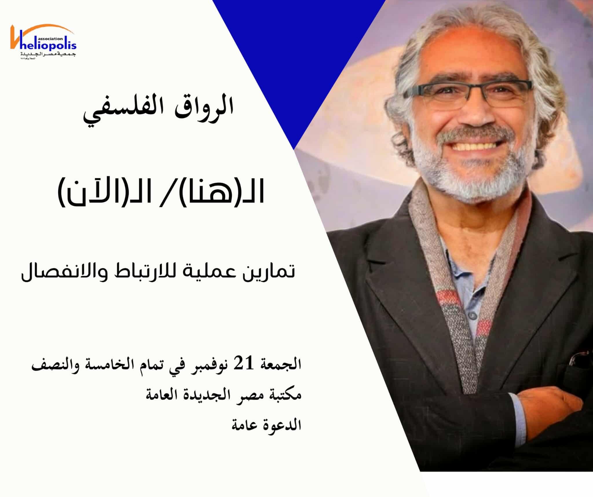 تنظّم مكتبة مصر الجديدة العامة أمسية ثقافية جديدة ضمن فعاليات «الرواق الفلسفي»، بعنوان «الهنا/الآن – تمارين عملية للارتباط والانفصال»، وذلك يوم الجمعة الموافق 21 نوفمبر في تمام الخامسة والنصف مساءً، بمقر مكتبة مصر الجديدة العامة.