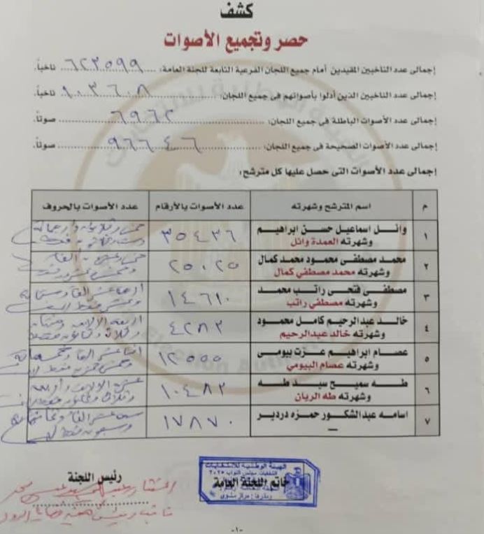 ووفقًا للحصر العددي تقدم وائل إسماعيل حسن، من حزب مستقبل وطن، حيث حصل على 35436 صوتا، كما حصل محمد مصطفى حزب مستقبل وطن، حصل على 25025، وحصل هيلاسلاسي غني ميخائيل، مستقل، حصل على 18655، وأسامة عبد الشكور، حصل على 17876، ورياض عبد الستار "مستقل "، حصل على 17628 ، وحازم الدروي، حصل على 15407 "مستقل".