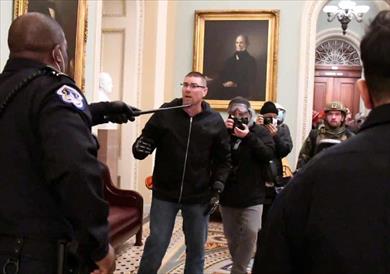 حصل ضابط شرطة على إشادة، بسبب دوره في توجيه حشد غاضب بعيدًا عن قاعات مجلس الشيوخ خلال اقتحام بعض مؤيدي الرئيس المنتهية ولايته دونالد ترامب، لمبنى الكابيتول الأمريكي، الأربعاء الماضي.
