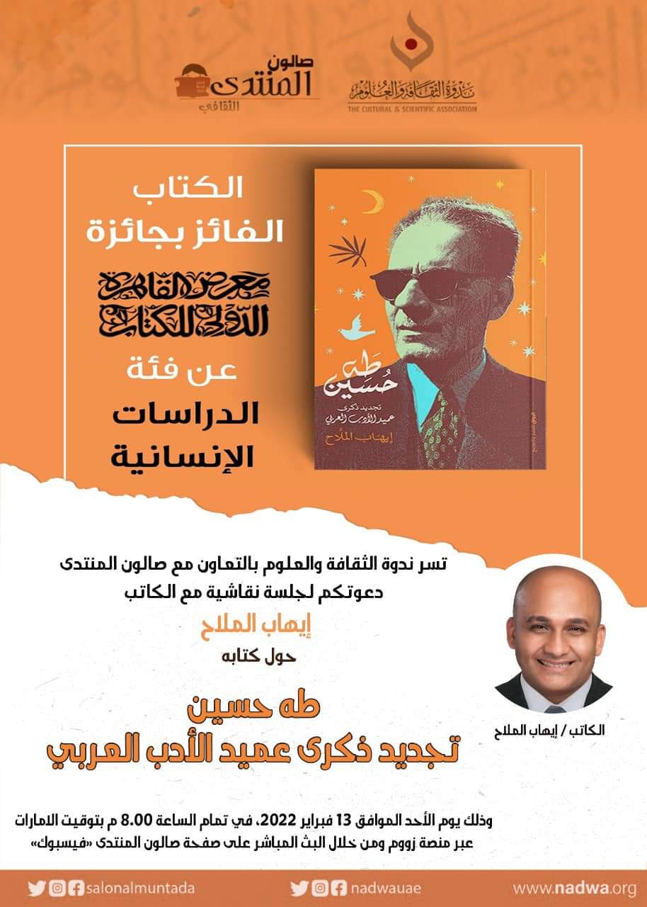 يستضيف صالون المنتدى الثقافي، الكاتب والناقد المصري إيهاب الملاح، وذلك لمناقشة كتابه طه حسين: تجديد ذكرى عميد الأدب العربي، وذلك اليوم الأحد عبر منصة زوم الإلكترونية، في تمام الساعة الثامنة بتوقيت الإمارات.