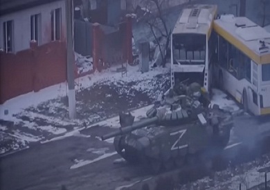 ويُظهر مقطع الفيديو دبابة مرسوم عليها حرف «Z»، الذي استخدمته روسيا كرمز لحملتها العسكرية في أوكرانيا، تتراجع إلى الوراء وتصطدم بحافلات مدمرة قبل أن تطلق قذيفة على مبنى سكني مكون من 9 طوابق، ما أدى إلى اشتعال النيران في الشرفات.