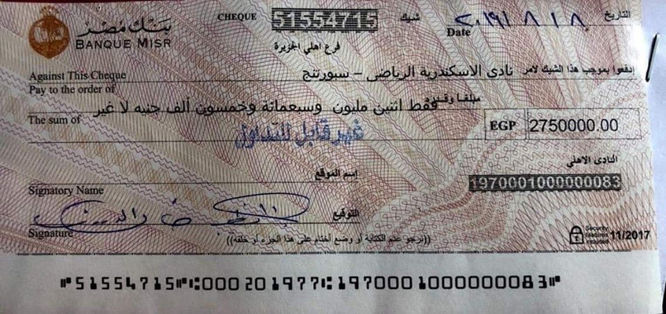 وحصل "الشروق" على صورة من الشيك المقدم من النادي الأهلي لشراء إيهاب أمين من سبورتينج مقابل 2 مليون و750 ألف جنيهًا مصريًا.