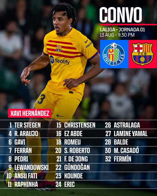 أعلن تشافي هيرنانديز، المدير الفني لنادي برشلونة، عن قائمة فريقه استعدادا لمواجهة خيتافي، في المباراة التي ستُقام مساء اليوم الأحد على ملعب كوليسيوم ألفونسو ديفيز، ضمن منافسات الجولة الأولى من الدور الإسباني.