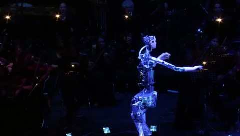 دخل روبوت بثلاثة أذرع، تاريخ الموسيقي بعد أن أصبح أول روبوت يقود فرقة في حفل موسيقي بمناسبة الذكرى الـ25 لتأسيس أوركسترا دريسدن السيمفوني في المانيا، اليوم الأحد.