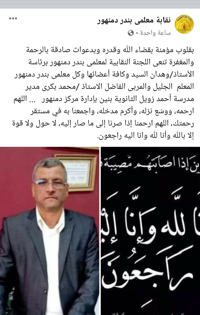 ومن جانبها نعت اللجنة النقابية لمعلمي بندر دمنهور، برئاسة وهدان السيد وكافة أعضائها وكل معلمي بندر دمنهور المعلم الجليل والمربى الفاضل محمد بكرى، مدير مدرسة أحمد زويل الثانوية بنين بإدارة مركز دمنهور، سائلين الله أن يرحمه بواسع رحمته وأن يتغمد الفقيد بواسع رحمته ويسكنه فسيح جناته ويلهم أهله الصبر والسلوان.