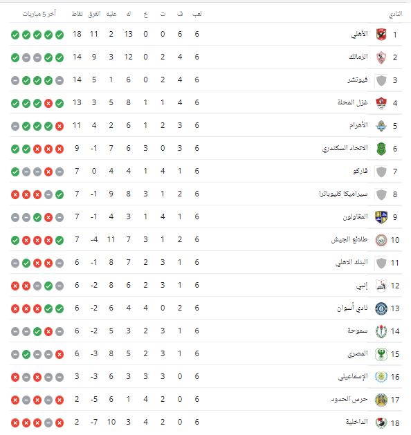 وحافظ الأهلي على صدارته لجدول ترتيب فرق الدوري العام، برصيد 18 نقطة، بينما تواجد الزمالك في المركز الثاني بـ 14 نقطة، وفيوتشر ثالثا بنفس الرصيد، وغزل المحلة رابعًا بـ 13 نقطة.