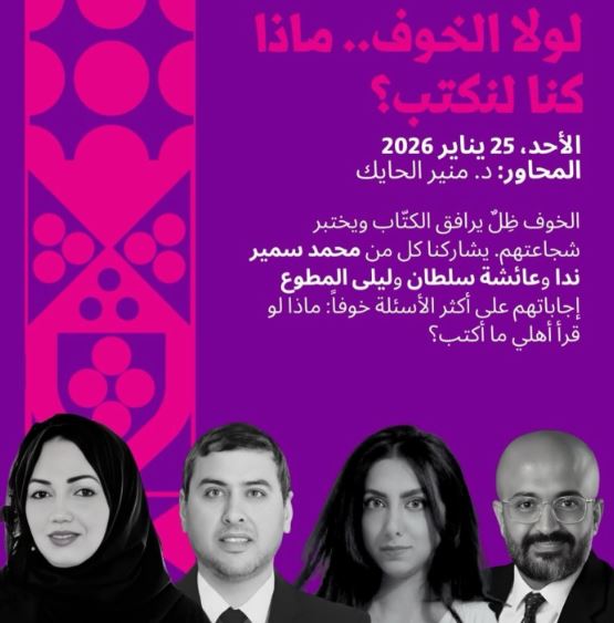 وتناقش الجلسة فكرة "الخوف" كظل يرافق الكتاب ويختبر شجاعتهم، حيث يقدم المشاركون إجاباتهم على أكثر الأسئلة خوفا: "ماذا لو قرأ أهلي ما أكتب؟".