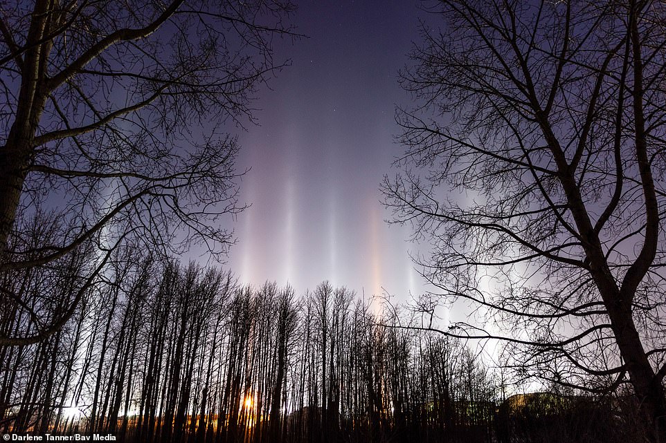وهم الأعمدة الخفيفة، كما التقطتها عدسة أحد المصورين في لحظات نادرة، جاء نتيجة انخفاض درجة الحرارة إلى 30 درجة مئوية تحت الصفر، ما جعل من سماء لاكومب ألبرتا ملجئا للعديد من الأعمدة الضوئية الخفيفة المتوازية المنيرة التي تبدو وكأنها واقعة من السماء، وفقا لما سجلته عدسة المصور دارلين تانر.