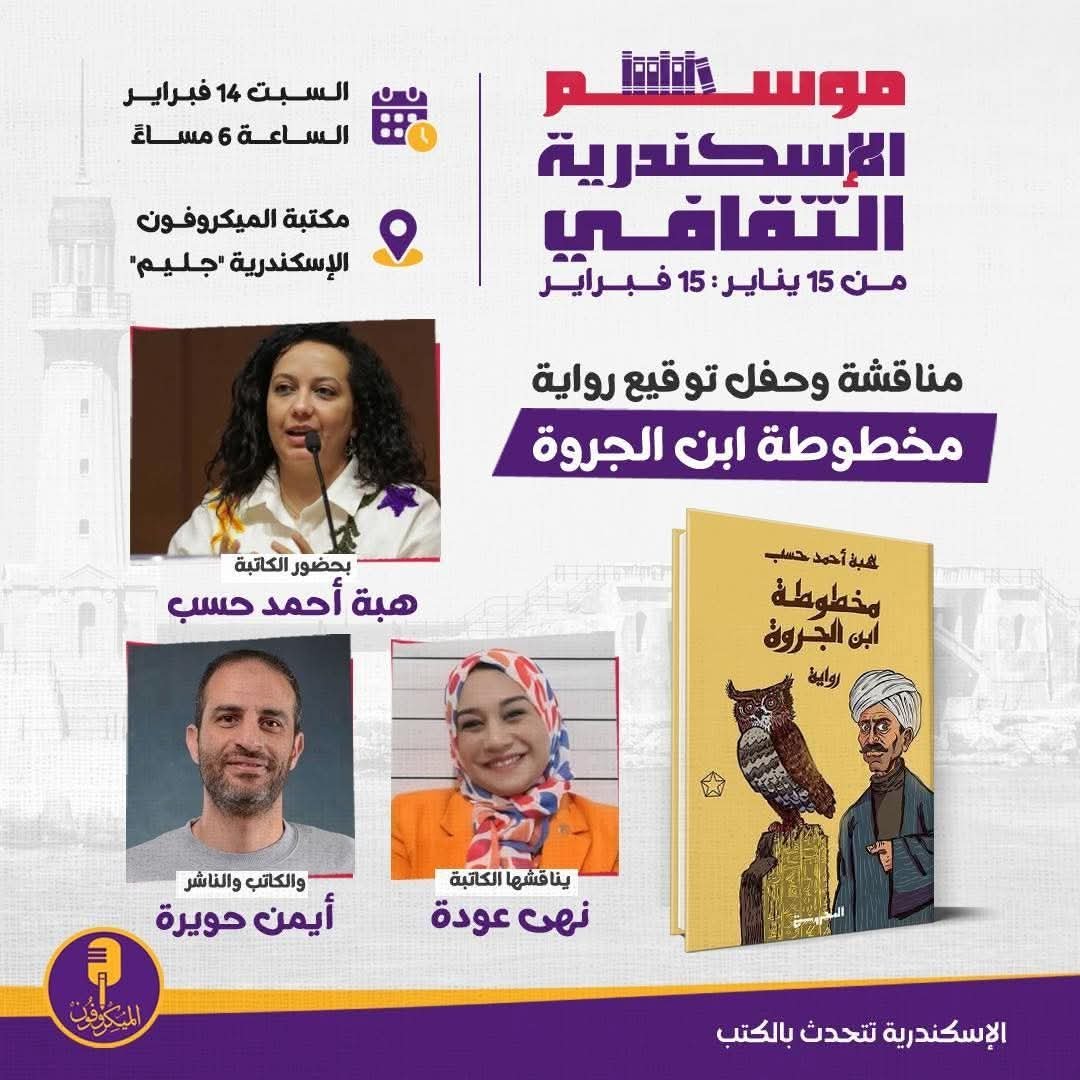 تستضيف مكتبة الميكروفون بالإسكندرية (جليم)، في السادسة مساء اليوم السبت 14 فبراير، مناقشة وحفل توقيع رواية «مخطوطة ابن الجروة»، وذلك ضمن فعاليات موسم الإسكندرية الثقافي الممتد من 15 يناير إلى 15 فبراير.