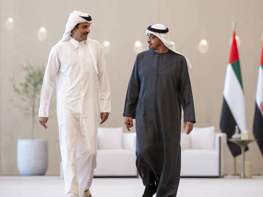 ووفق وكالة أنباء الإمارات (وام)، كان الشيخ محمد بن زايد آل نهيان رئيس الإمارات في مقدمة مستقبلي الشيخ تميم لدى وصوله مطار البطين في أبوظبي.
