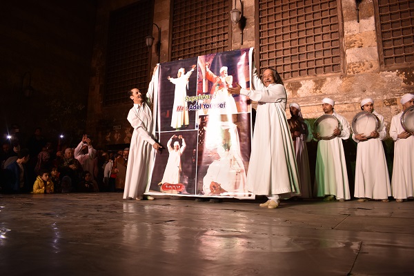 «الصبر حلو أوي وجميل بس اللي يصبر.. عادل يوسف ملك الصاجات طلع معاش وأنا خلوصي قبل منه.. بشاير الخير جاية من عند الحبيب سلم ياطير على الحبيب»، عبارات احتوت على بعض الأغاني والمواويل والدعاء إلى الله ومديح النبي محمد صلى الله عليه وسلم والأولياء الصالحين، التي ألقاها أحد المنشدين بالفرقة توديعا له، وسط أضواء خافته يصاحبها الرقص بالتنورة.