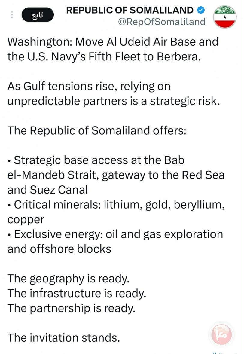 في بيان رسمي نُشر على حساب "ريبابليك إكس"، دُعيت واشنطن إلى نقل قاعدة العديد الجوية الأمريكية، الموجودة حاليًا في قطر، والأسطول الخامس التابع للبحرية الأمريكية، المتمركز حاليًا في البحرين، إلى مدينة بربرة الساحلية في أرض الصومال.