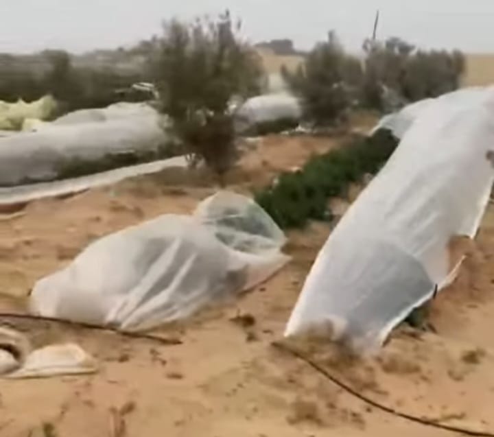 وكشف مواطنون عن تعرض المزارع لخسائر، خاصة الزراعات التي تعتمد على الصوبات والأنفاق البلاستيكية، نتيجة شدة الرياح. كما تضررت خيام معارض رمضان في الشوارع الرئيسية بالعريش والشيخ زويد، فيما لم تُسجل إصابات بشرية.