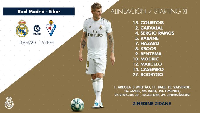 أعلن الفرنسي زين الدين زيدان المدير الفني لريال مدريد عن تشكيل فريقه لمواجهة إيبار، والتي ستُقام اليوم الأحد على ملعب ألفريدو دي ستيفانو، ضمن منافسات الجولة الـ28 من الدوري الإسباني.